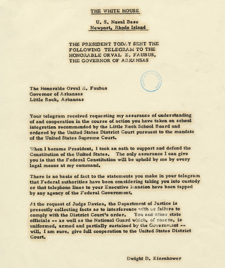 That somehow the Racial Violence and institutional racism legal Segregation was could have been ended by the legislatures of the deep South and the North is pure Conservative lie, no other name for it! There was no political will to enact such a change. The growth of Federal power was a rational legal response to segregationist intransigence. See President Eisenhower’s telegram to Governor Faubus dated September 5, 1957: