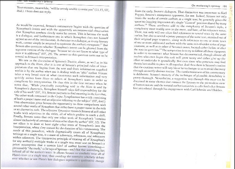 In this page and a half Xenos describes the Straussian method used in the interpretation of Spinoza’s Treatise and Xenophon’s Hiero. But here is a description of the Straussian Method that applies to the whole of Strauss’ interpretive endeavors: