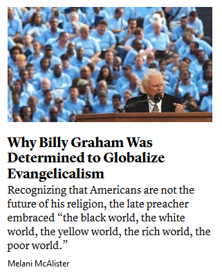 Billy Graham, who died Wednesday at the age of 99, may have been “America’s Pastor,” but he was also a man of the world. From the early days of his ministry, when he visited U.S. military forces in Korea, to his quiet message of healing at Washington Cathedral in the aftermath of September 11, Graham was a frequent commentator on—and participant in—global politics. He used his status as the most important American religious figure of the 20th century to help lead American evangelicals into a more robust engagement with the rest of the world. He was also an institution builder who was deeply invested in Christianity as a global faith.