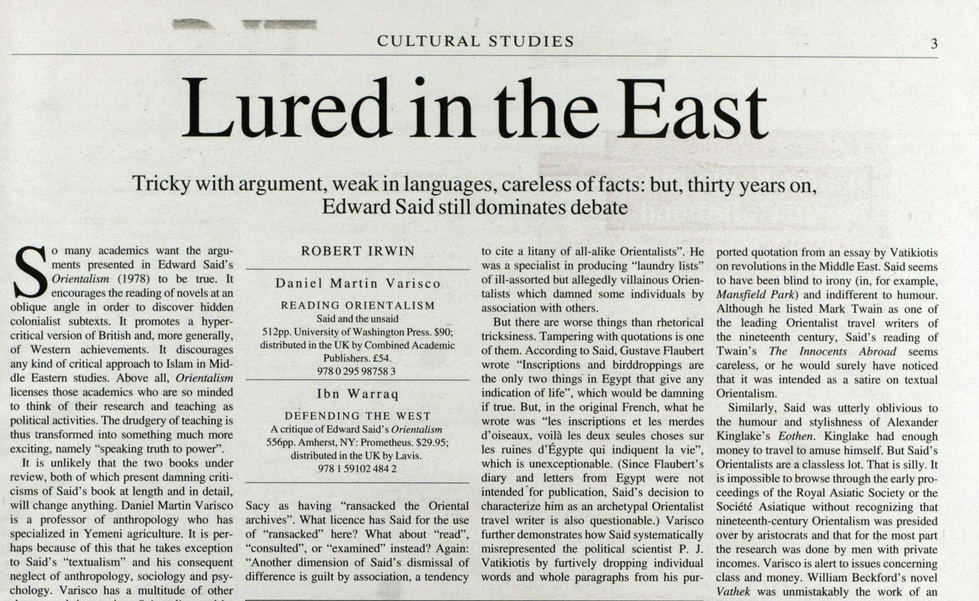 Another question that might be asked: why would Kramer frame his defense of Lewis in a rhetorical frame of ‘last Orientalist’ as Orientalism was the title of Edward Said book? Here is a review in the May 9, 2008 Times Literary Supplement of Defending the West: A Critique of Edward Said’s Orientalism by Ibn Warraq and Reading Orientalism: Said and the Unsaid (Publications on the Near East) by Daniel Martin Varisco. A screen shot of the review in question and a link, behind a pay wall: