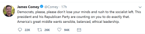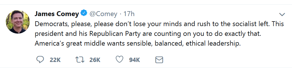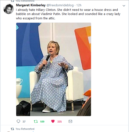 Mr. Comey, like his predecessor J. Edgar Hoover, is a paranoid political hysteric with a sense of mission, and once possessed a malign power. He now poses as a beacon of moral/political virtue, in the Age of Trump: the Authoritarian Personality is true, the reader need only pay attention to the unhinged political discourse of the present . Look to the Margaret Kimberley tweet on the porcine Dowager Empress of ‘The Resistance’ Hillary Clinton: