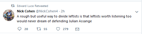 What a happy combination, Cohen & Luce, on defining ‘leftist’ from an utterly corrupted, but self-congratulatory, ‘Liberal’ perspective. Assange and WikiLeaks just didn’t redefine Journalism, they simply practiced Journalism in an age of Corporately owned News sources. And their hirelings, like Cohen & Luce, who manufacture the respectable bourgeois Party Line. Finley Peter Dunne describes what Journalism is: