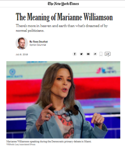 Before reading Mr. Douthat’s appraisal of the Williams’ candidacy, the reader should first go to this YouTube video, by New Progressive Voice ,that analyses in depth how the women of ‘The View’, treated Marianne Williamson.