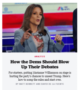 Sub-headline: For starters, putting Marianne Williamson on stage is hurting the party’s chances to unseat Trump. Here’s how to scrap the rules and start over.