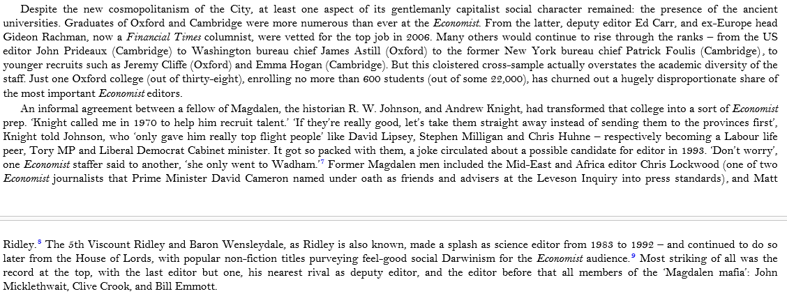 Pages 334 and *335 of ‘Liberalism’ offers some revelatory insights as to the how and why of career paths, for the favored few, who manage to attend and matriculate/graduate from a small number of exclusive Oxford colleges. A reference to the ‘Magdalen Mafia’ in the context of employment at The Economist provides insights, even Gideon Rachman is mentioned as the beneficiary of an elite education.