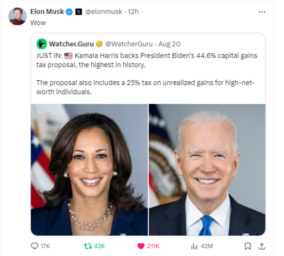 Editor: Elon Musk is already scolding Harris for her Capital Gaines Tax ‘promise’ or ‘backs’ the Biden’s Tax Plans. Neo-Liberals adapt from political moment to political moment!