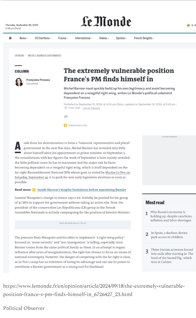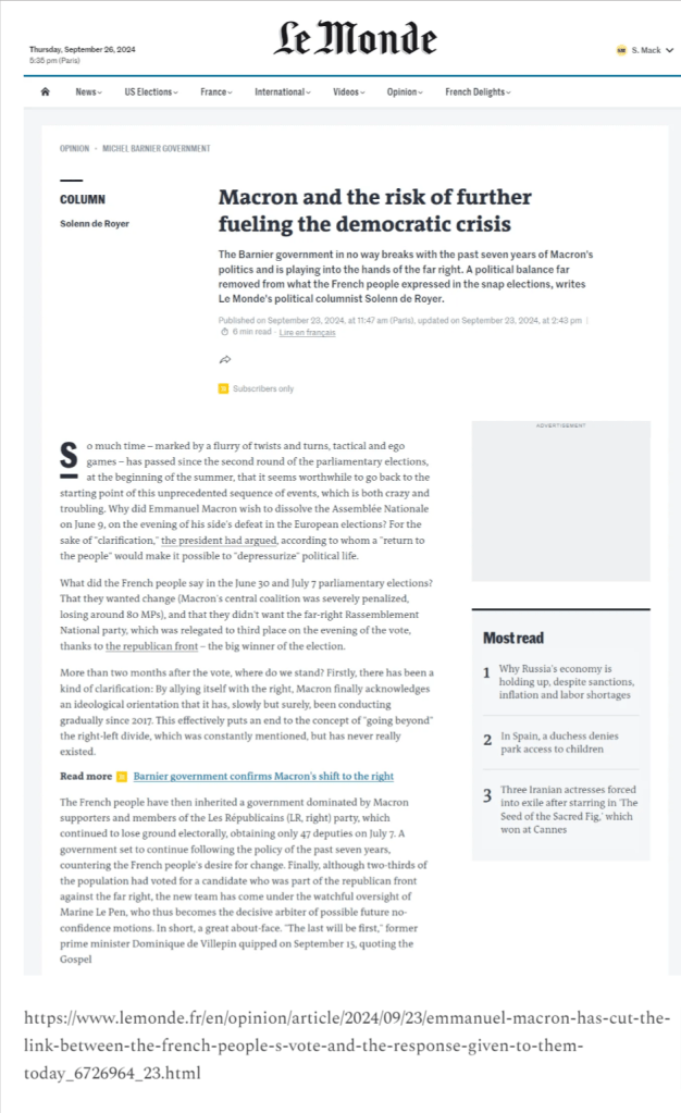 Editor: I will not pretend that I have done nothing more that provide the links, to these two Le Monde Opinion commentaries. The Reader need only look at the compelling evidence that Macron is mendacious, incompetent and politically toxic. The fictional ‘Jupiterian Politics’ that once Public Relations salvo, has de-volved into a permanent political fracturing ?