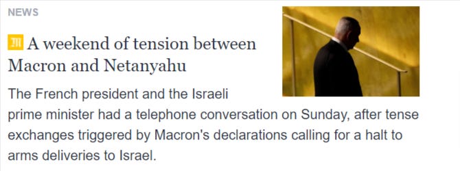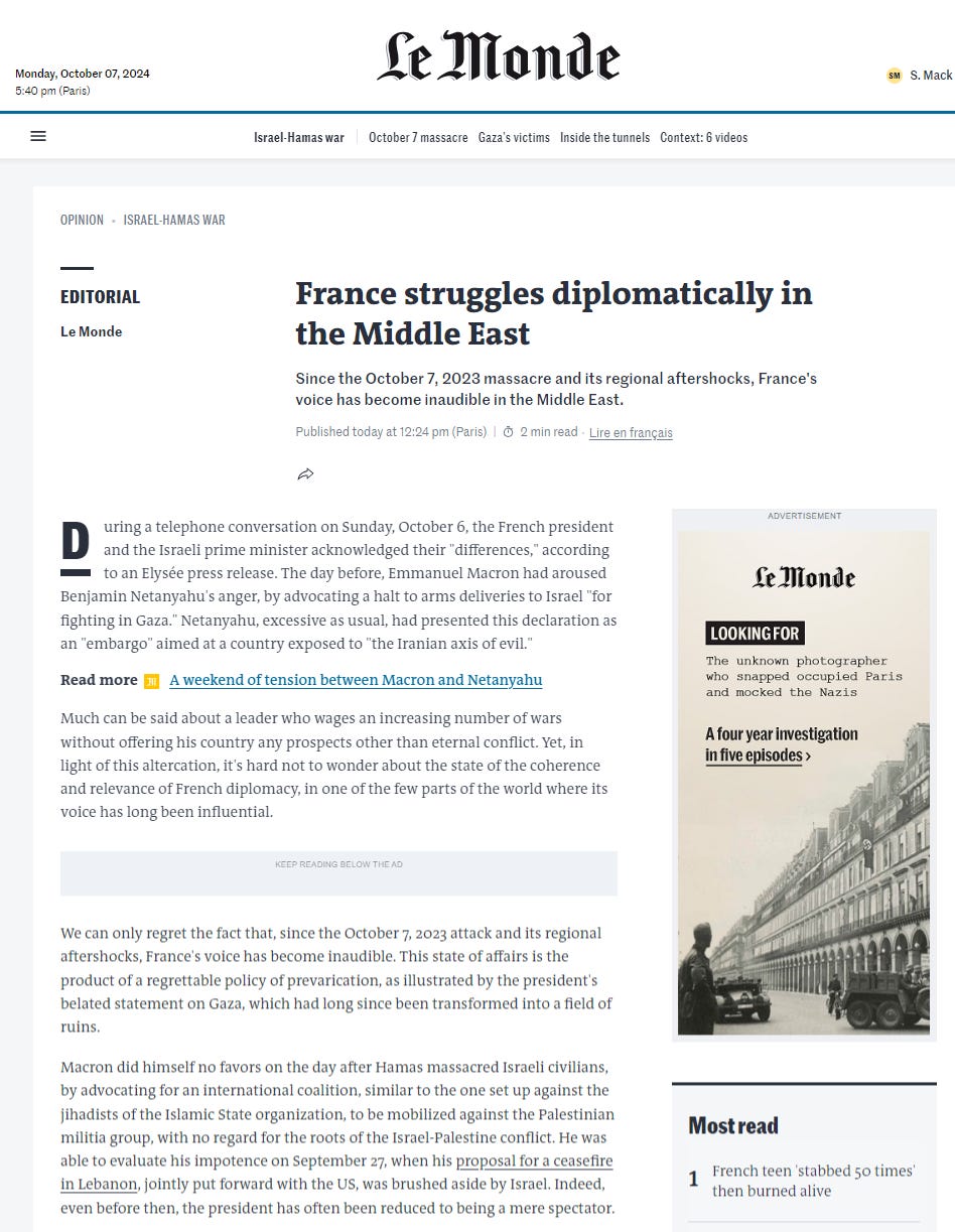Reader, here is Le Monde opining ‘France’s voice has become inaudible in the Middle East’…