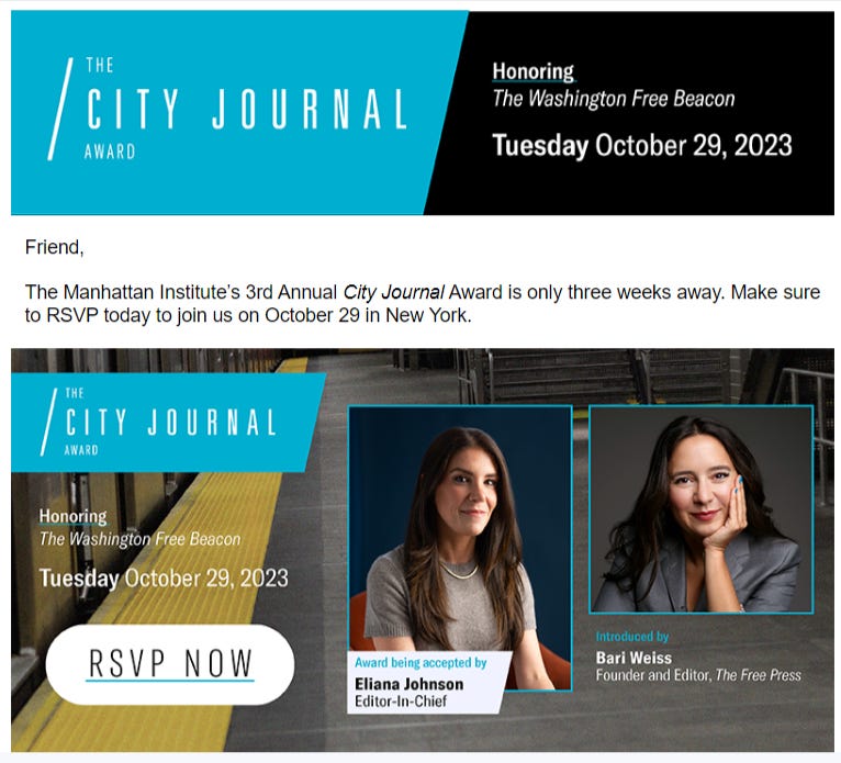 This came in my e mail this morning. Eliana Johnson, Bari Weiss & The Washington Free Beacon, can’t quite provide cover for The City Journal’s utter bad judgement about Eric Adams. Note the proximity to Halloween !