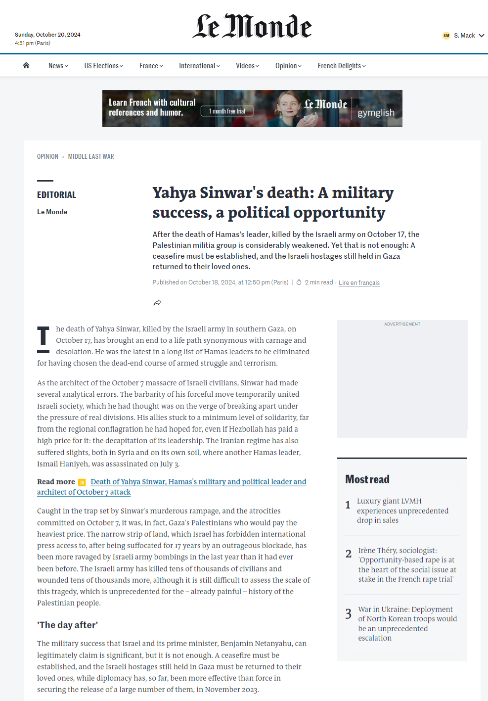 Editor: Note this Editorial from Le Monde of October 20, 2024 . Consider it the companion piece to Jean-Philippe Rémy!