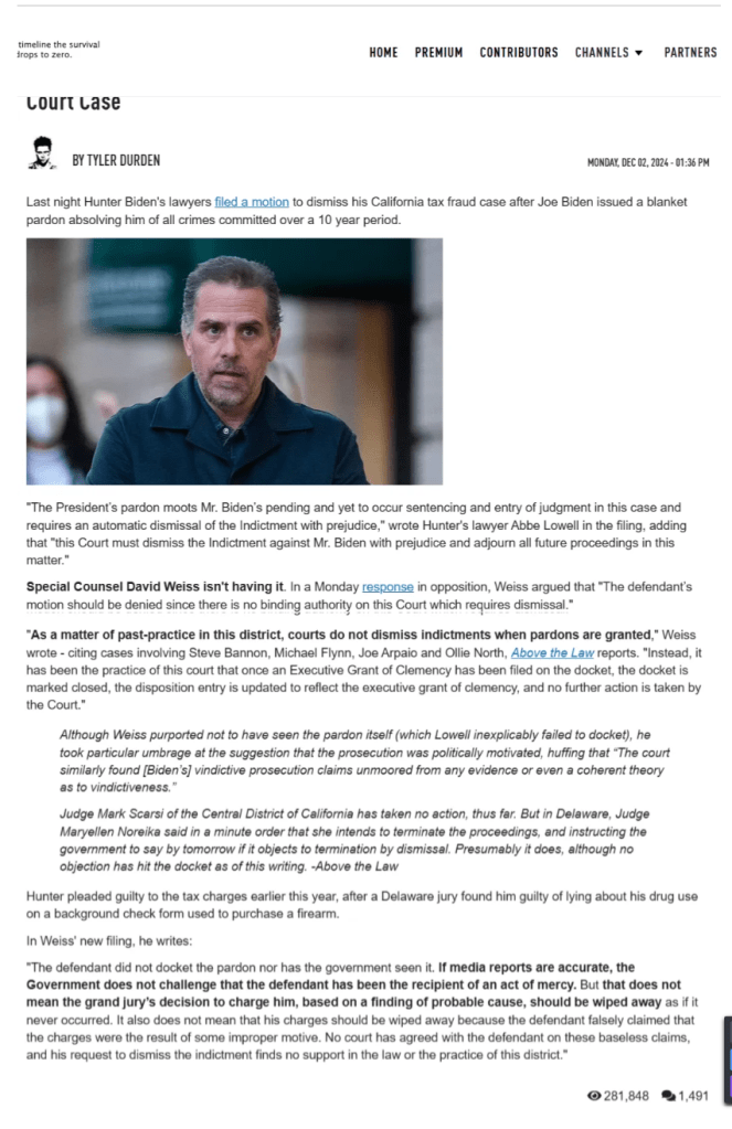 It was always a good bet that the president would break his word as soon as it was politically safe to do so. But he doubled down on dishonesty in his statement about the pardon, claiming Hunter’s prosecution was a result of “political pressure” on the judicial process. Nonsense. The charges stem from Hunter’s reckless lifestyle, abetted and financed by his willingness to trade shamelessly on the family name. A previous plea agreement between Hunter and federal prosecutors fell apart last year under scrutiny from a federal judge.