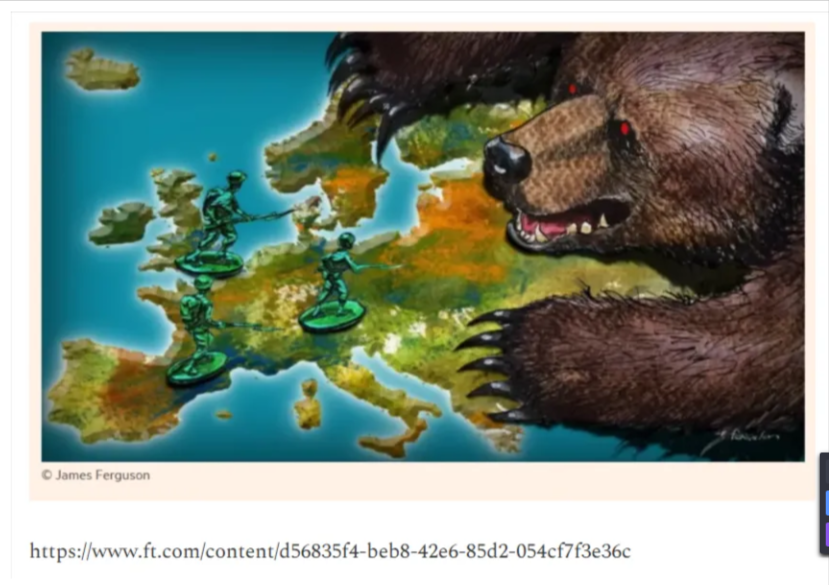 The rapacious Russian Bear is the nightmare of ‘Europe’ : the hallowed remaines of the ghost of Jean Monnet’s Coal and Steel Cartel, of The Cold War years. As that is by now the ricketry remains of a dream of ‘Europe’, incapable of its own realization, but hanging on a notion of its viability, via Technocratic chatter at high volume. From Newspapers like The Financial Times, and its cadre of Experts like Gideon Rachman. NATO is the linchpin that now holds together this unrealised fraturing Super State! Not to speak of a Cold War relic rehabilitated as need be!