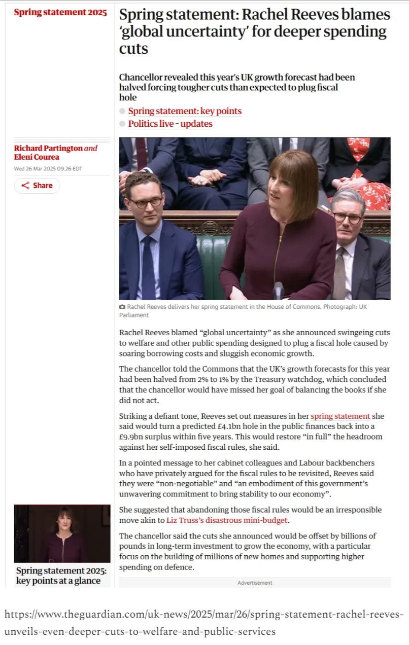 Rachel Reeves, the chancellor of the Exchequer, cut some infrastructure funding and pensions benefits, adding that more “difficult decisions” would come later this year.