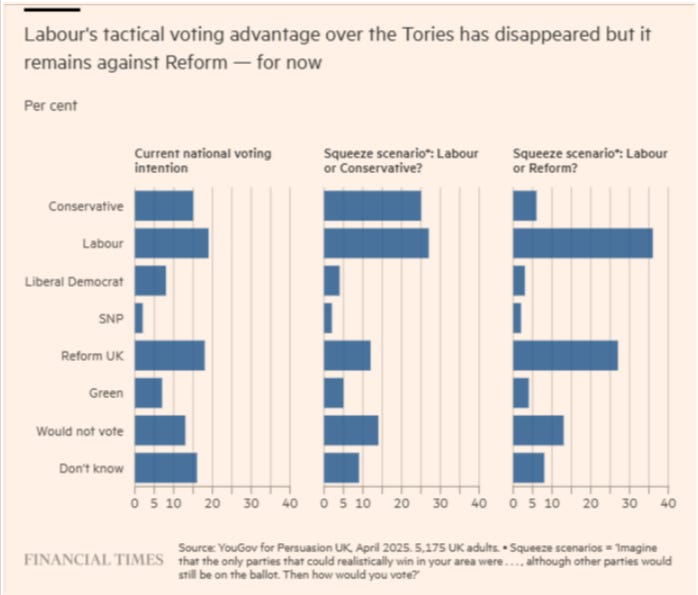 Offering more hope to Labour MPs, there are also signs in Persuasion’s data (see chart) that anti-Farage tactical voting might buoy up support for their party: enough voters in red wall areas could decide to back the incumbent explicitly to keep Reform out — even Conservatives seem willing to do so.