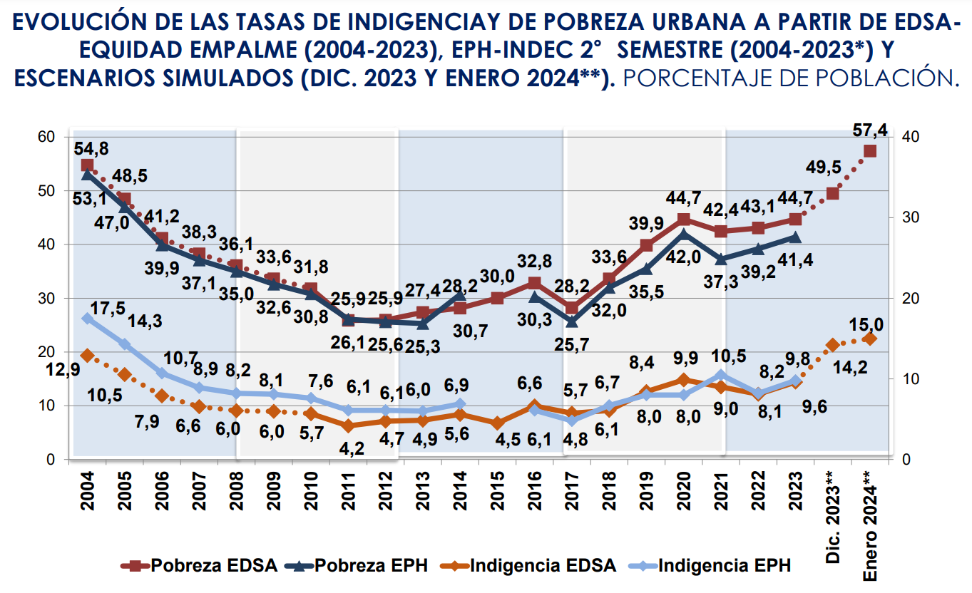 According to the report, which analyzed the inflationary effects of the 54% Argentine peso devaluation in December, poverty rose from 44.7% in the third quarter of 2023 to 49.5% in December, then 57.4% in January.