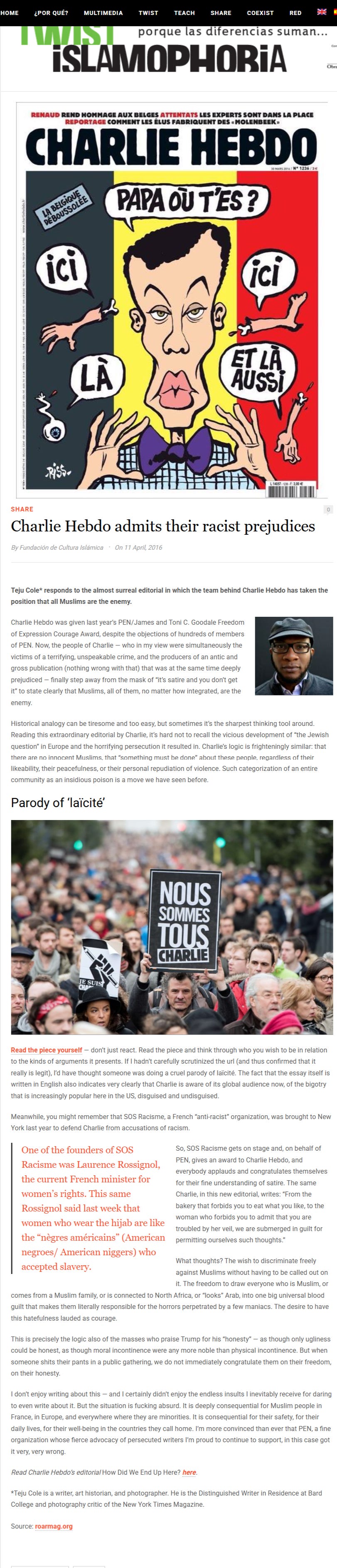 It’s like this Political Rag missed the utter RASISM of Charlie Hebdo, while celebrating Political Hysteric Allan Bloom ! Call it an Historical Re=Write!