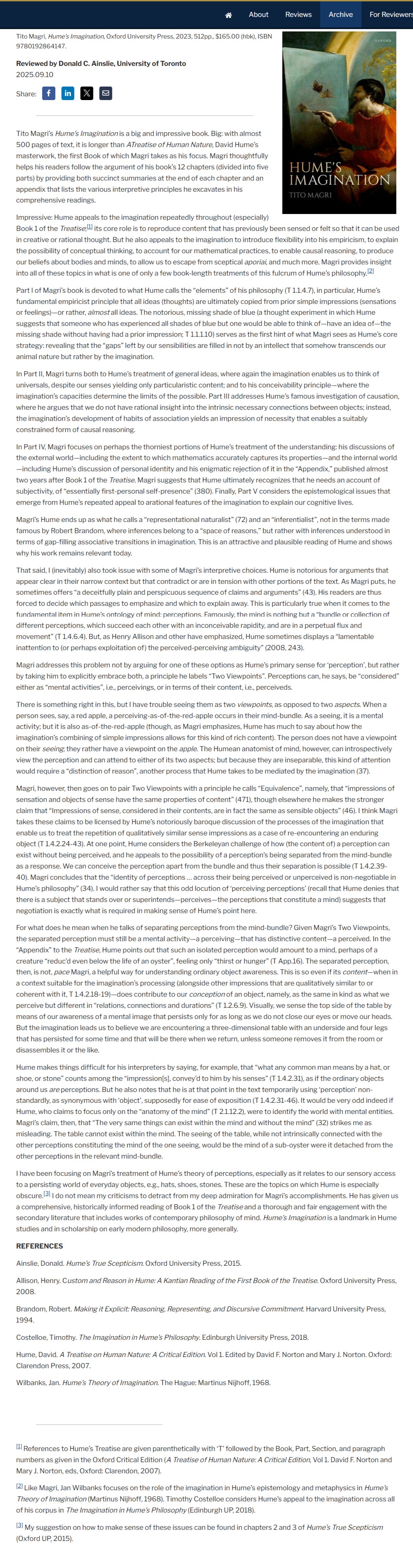 Hume’s Imagination Tito Magri, Hume’s Imagination, Oxford University Press, 2023, 512pp., $165.00 (hbk), ISBN 9780192864147. Reviewed by Donald C. Ainslie, University of Toronto,