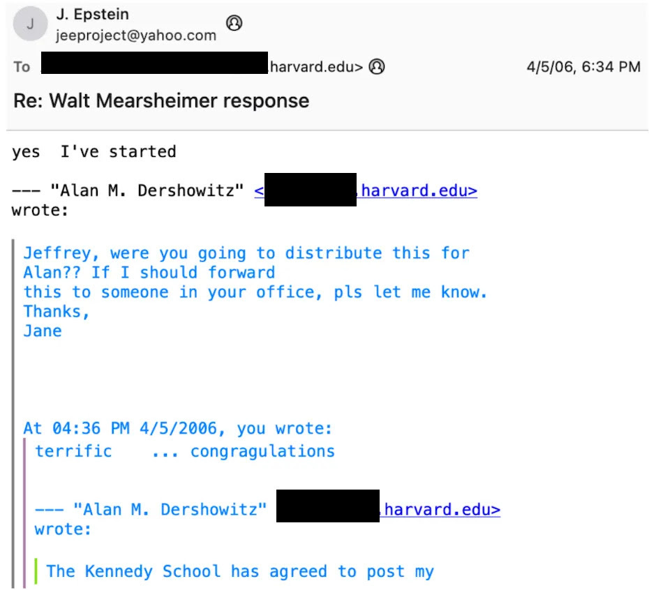 It seems not a day goes by when we are not learning more about Epstein’s connections to Israel. For example, the outstanding Drop Site News has revealed that Epstein worked with lawyer Alan Dershowitz back in the 2000s to attack academics John Mearsheimer and Stephen Walt. The pair had co-authored a paper that was published by Harvard Kennedy School that was titled: “The Israel Lobby and U.S. Foreign Policy.”