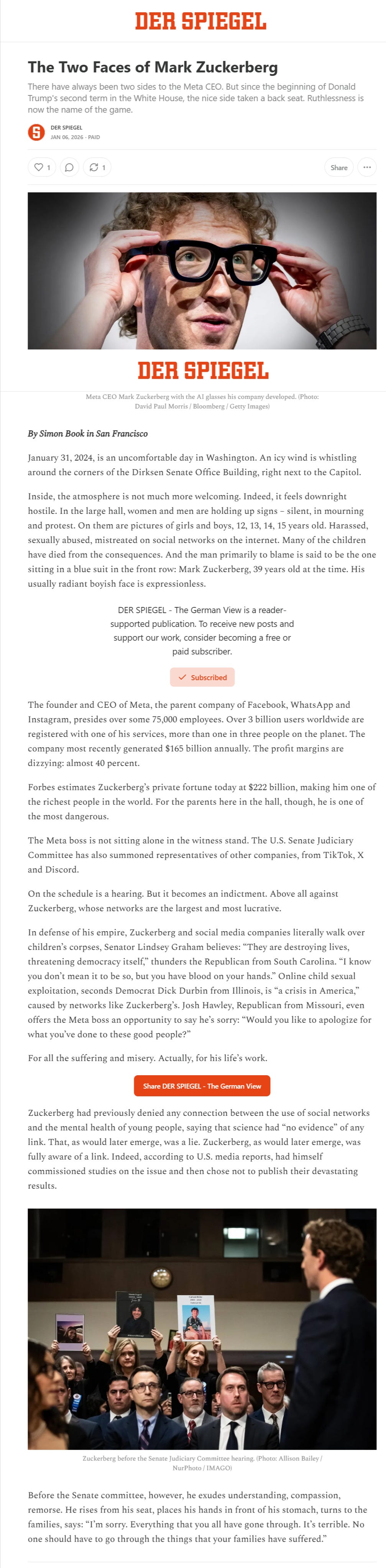Almost one year into Donald Trump’s second term, the answer seems clear. Trump’s MAGA takeover of America hasn’t just changed the U.S. It has also changed the Facebook boss. Nice Mark, it seems, is no longer needed in an America where selfishness and ruthlessness are considered the highest virtues. Nice Mark can go.