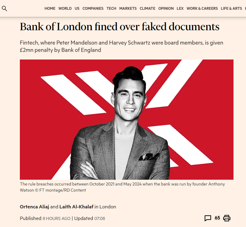 Watson told the FT that he “noted” the PRA’s action. He added: “The enforcement action announced today is against The Bank of London Group Limited and Oplyse Holdings Limited. I was not given any advance notice of it, nor was I a party to that settlement.”